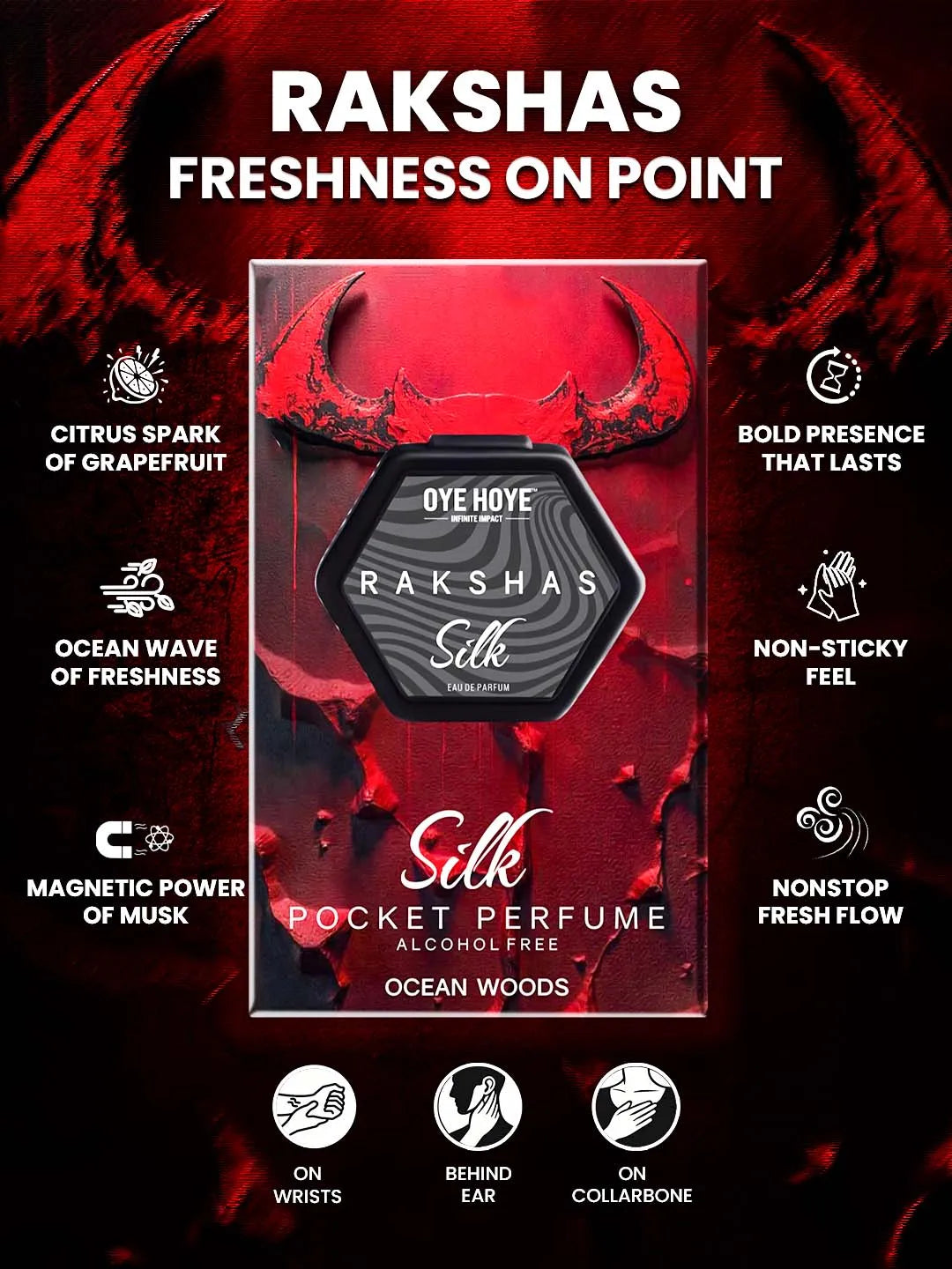 Unleash your dominant side with Rakshas, a bold and intense fragrance created for men who command attention without asking for it. Crafted as a silk-based pocket perfume, Rakshas blends raw power with refined elegance in a compact, travel-ready form.